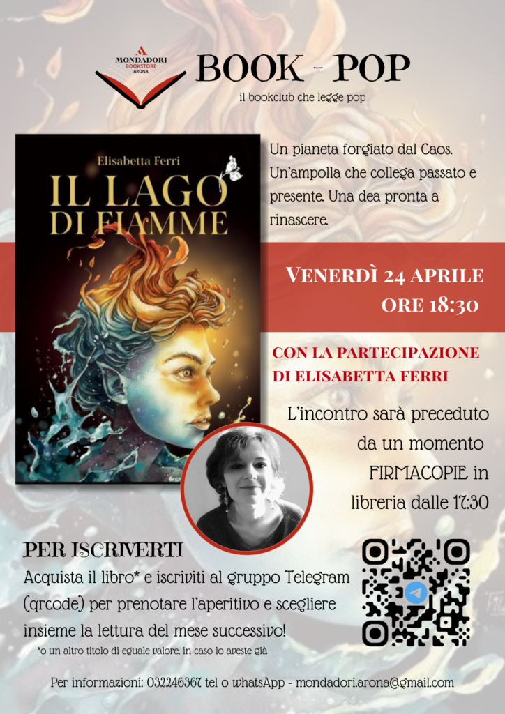 Firmacopie + Bookpop con aperitivo con Elisabetta Ferri, autrice de IL LAGO DI FIAMME; venerdì 24 aprile, dalle ore 17.30, Mondadori di Arona